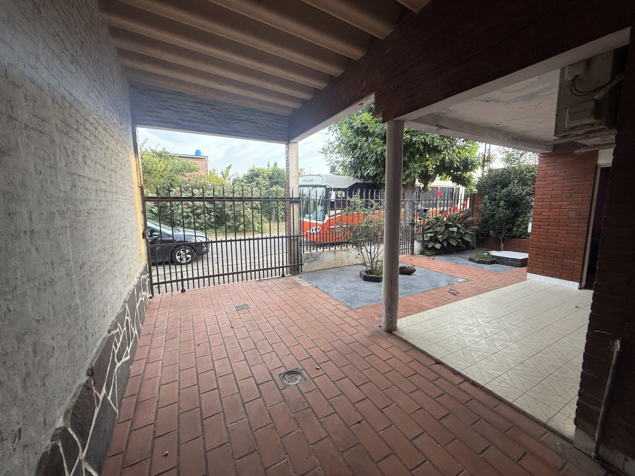 La casa cuenta con ingreso peatonal independiente y acceso vehicular con portón corredizo, que conduce a una cochera cubierta.