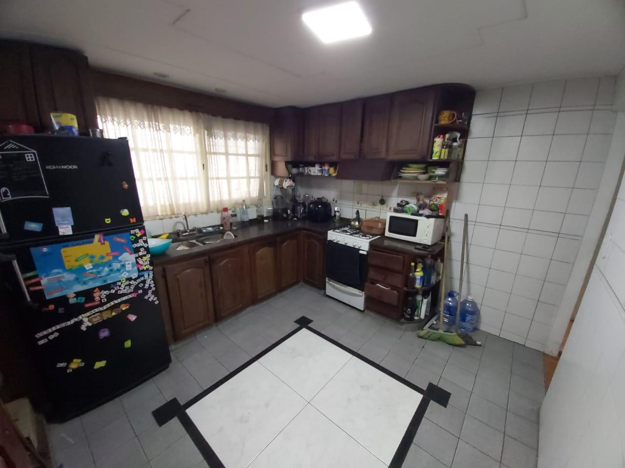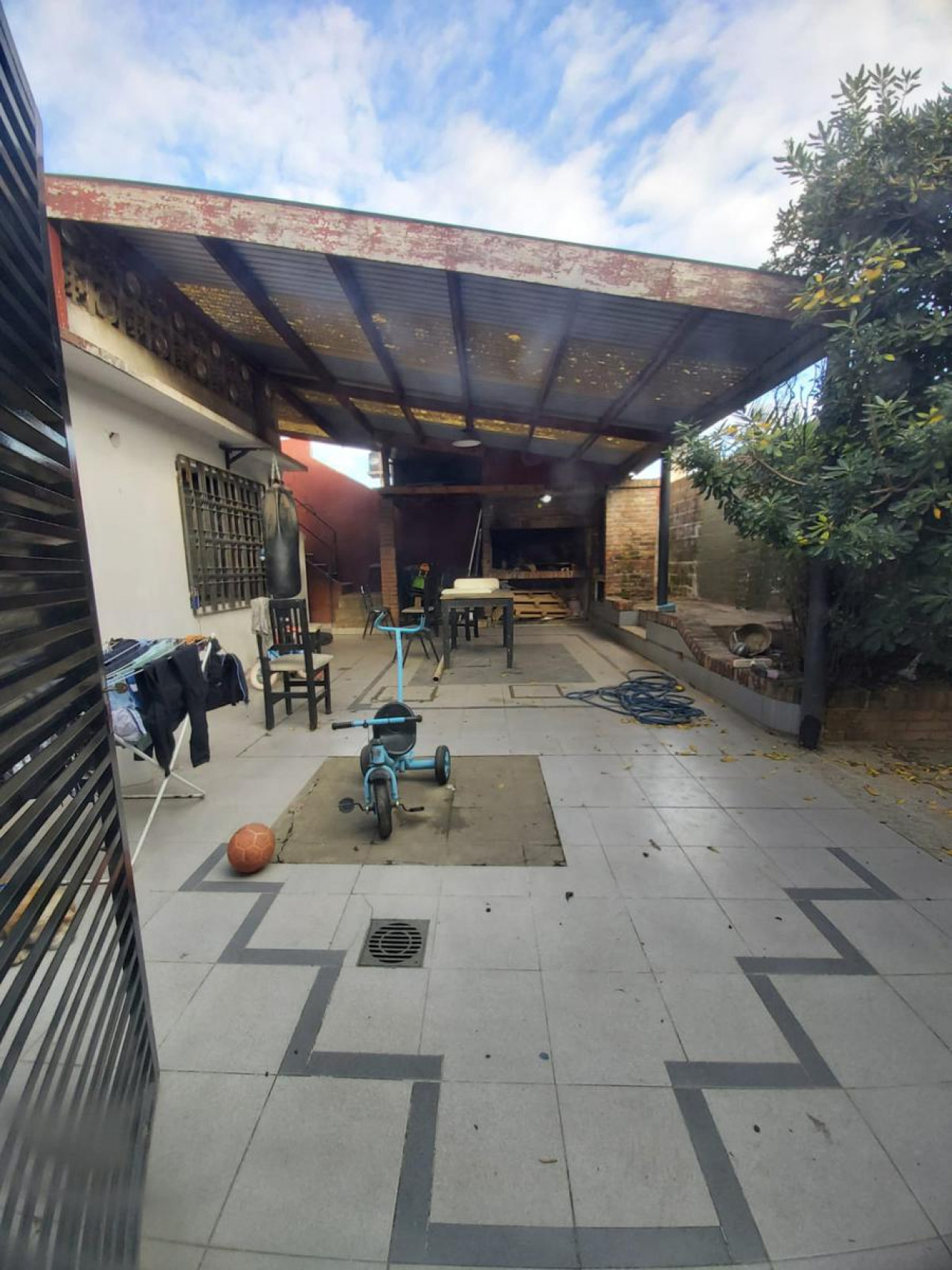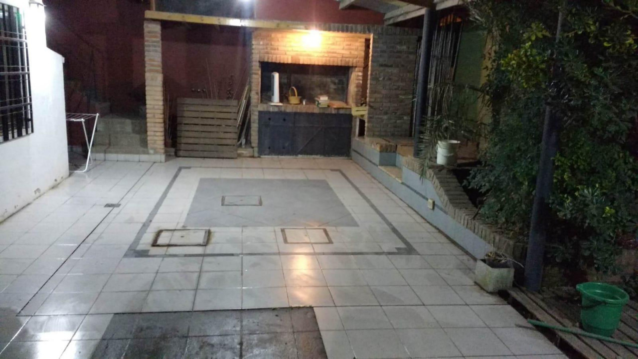 Patio trasero amplio con quincho y parrilla. Galpon guarda útiles y entrada para auto.